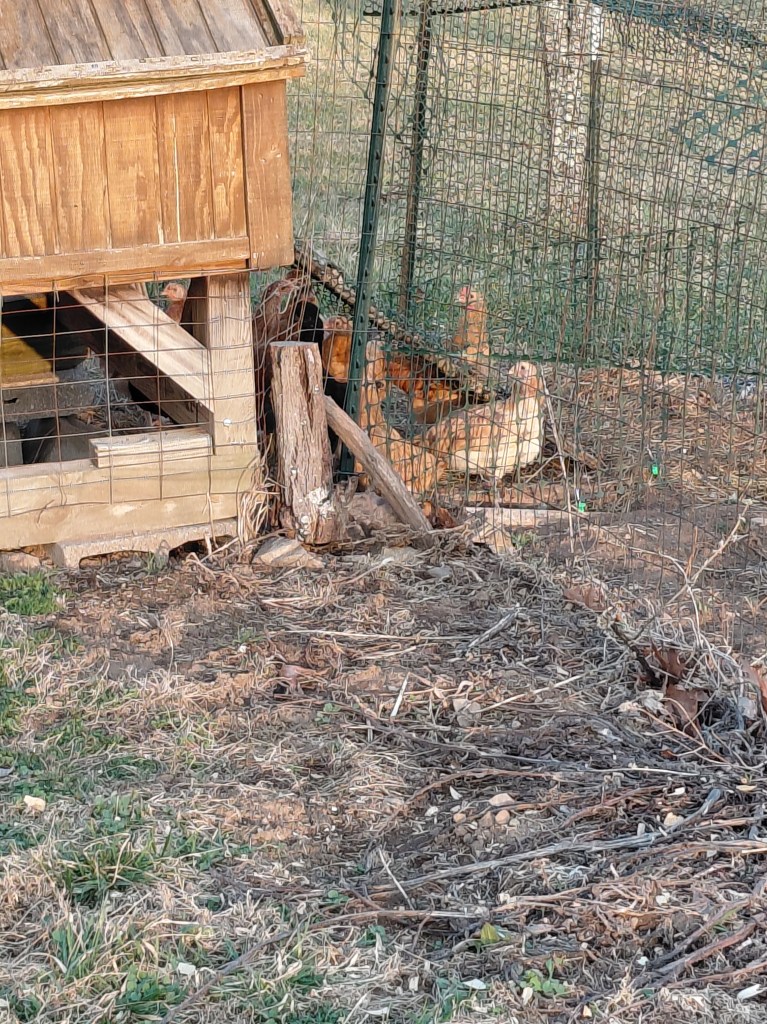 Two of the pullets were getting braver and leaving the coop. Unfortunately, the other 8 aren’t following and peer pressure hits and the two go back inside. A couple days ago, now that we have a series of spring days, they were forced out, with some scratch and some water in the pen so they get accustomed to being outdoors. This resulted in having to catch all 10 and walk them back up the ramp to the popdoor at dusk. Yesterday, only one appeared and never left the ramp. Today was coop cleaning day as they had made quite a mess of it in the few weeks they have been in it and my efforts with the snow shovel chased them all out into the pen. The coop is clean, they have a container full of food and another of water, however, as dusk approaches, not a single one has gone back into the coop. When it gets a bit darker, if they still haven’t figured it out on their own, another catch and up the ramp session will occur.