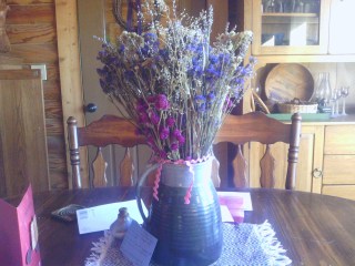 Upon arriving home, this bouquet was awaiting me. We have young organic farmer friends who as part of their business model, sell flower shares good for 15 weeks of fresh flower bouquets during the summer, my love had bought me a share for our anniversary and our friends, Bert and Gwynn had brought me the dried flower bouquet and share card while we were out leaving it on our table for me to find.