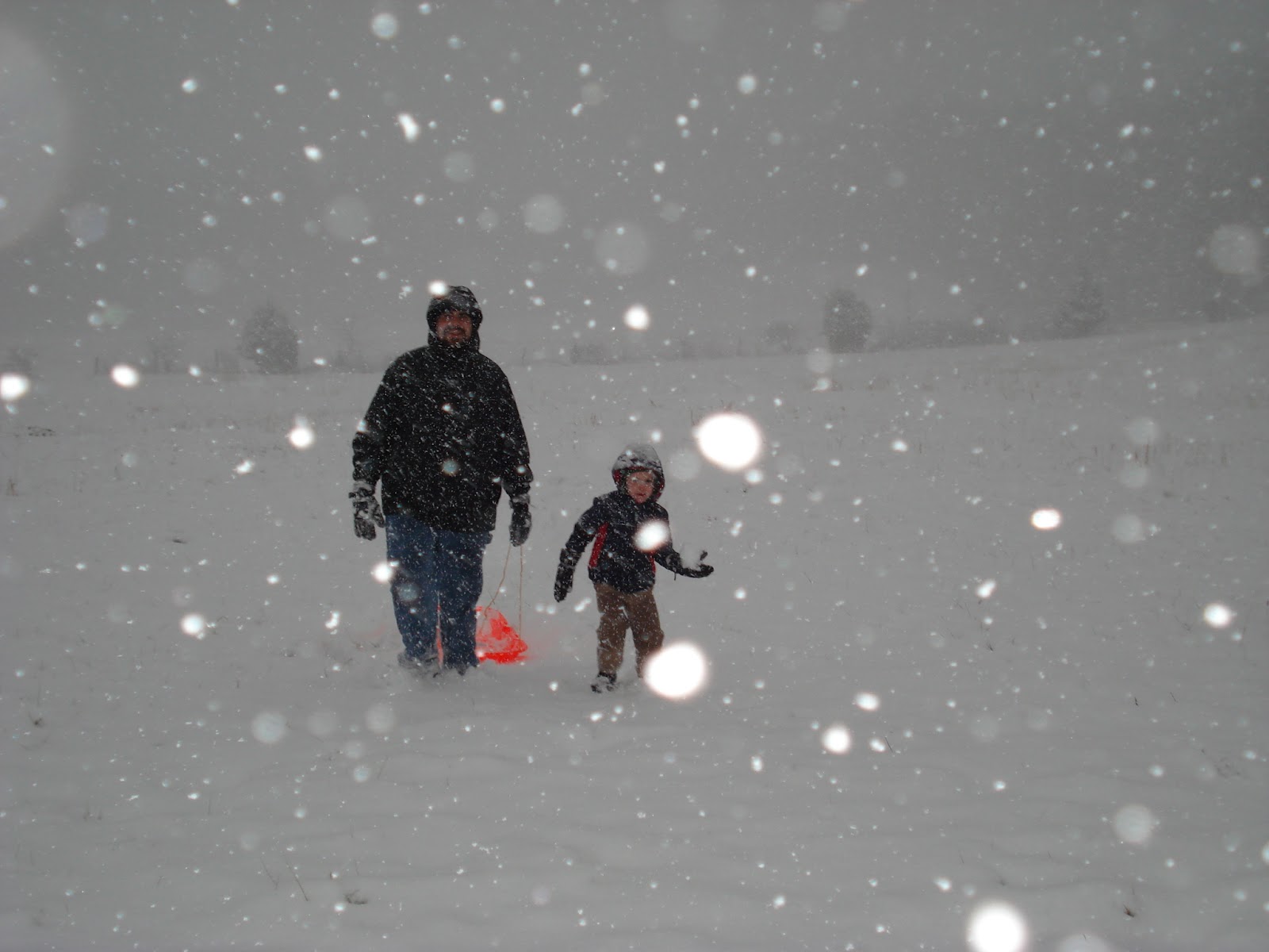 Grandson, dog, sled snowy day fun