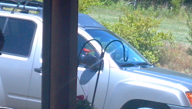 Mr. Cardinal sits atop the shepherd’s crook holding a blooming petunia just off the corner of the front porch and sings at the top of his voice, his repetitive song/warning, then flies to land on either of the two sideview mirrors of hubby’s SUV to repeat the warning. He will lean over the mirror, flutter to the window frame and attack the intruder again and again, but he just won’t leave his turf.