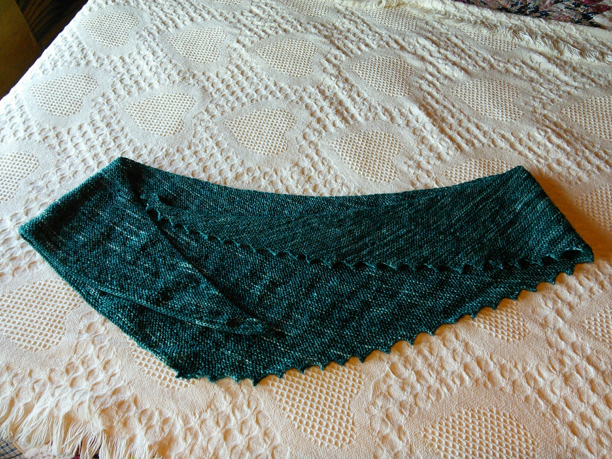 I finished my Hitchhiker made with Rivulet Island Yarn in Peacock color. It is larger than the pattern as I continued adding points to use up the yarn. It is currently drying on the spare bed downstairs.