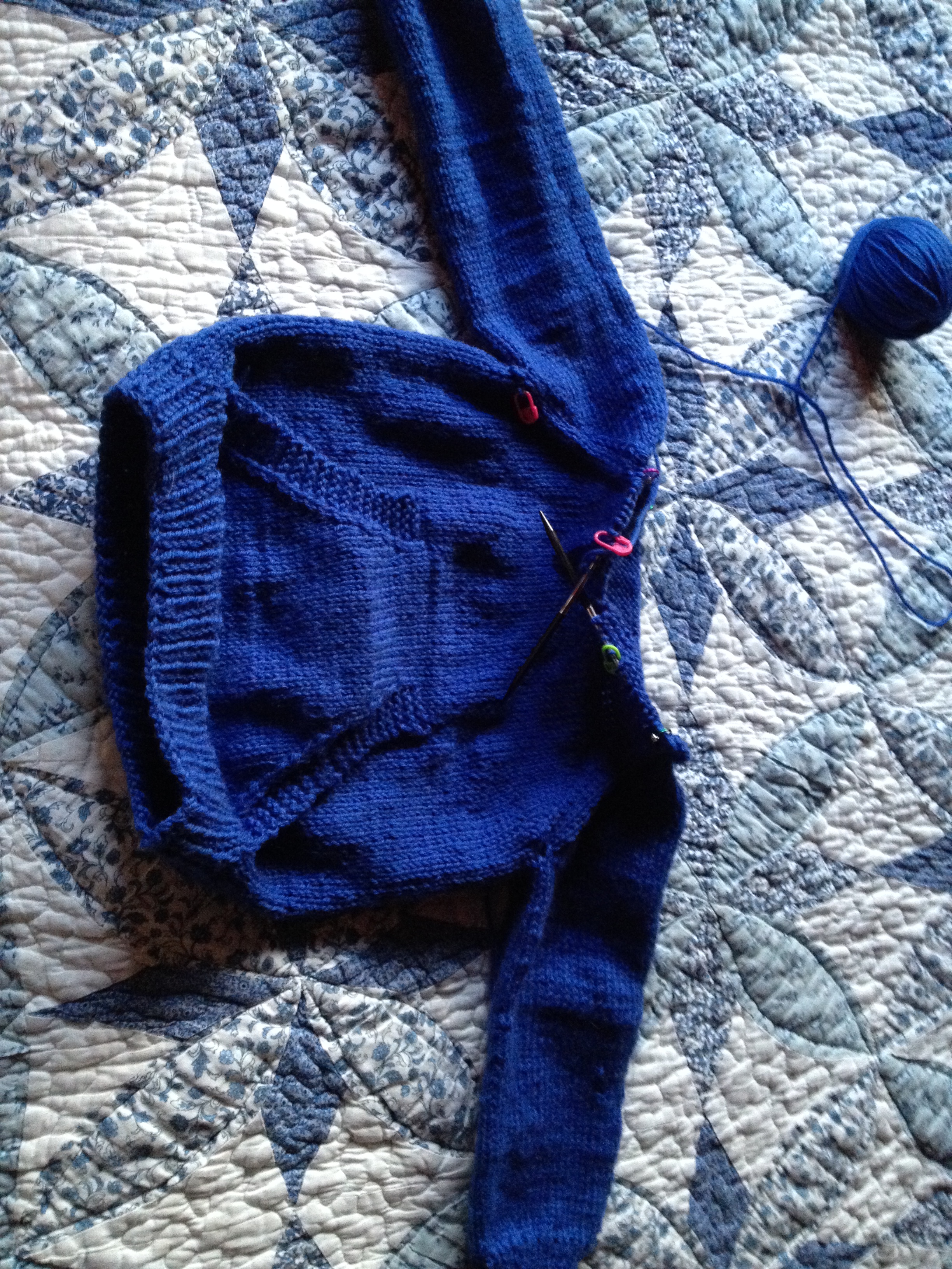 Knitting is progressing on Granddaughter #2’s Christmas sweater, a Wallaby. It looks like a knitted hooded sweatshirt with the pouch pocket. I am about to finish the body and start on the hood. The sleeves are on as this is a bottom up sweater and most of the loose ends are woven in. I had lots of knitting time between yesterday and the two hours of car time going and returning for the turkey. Granddaughter #2 called me a couple of days ago and asked for mittens too. I thought I would have enough of the sweater yarn to make them, but now I don’t think so, so we stopped at one of my favorite yarn shops on the way to get the turkey and bought a skein of a tweedy yarn with the same color in it to make them.