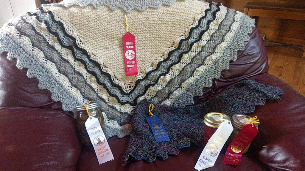 Last year for the first time, I finally submitted two shawls for exhibition and won two blue ribbons, totally shocking me. It emboldened to me exhibit again, expanding to several home canned goods, a skein of hand spun yarn, the shawl I spun and knit for Shave ‘Em to Save ‘Em, and a scarf from a skein of yarn from a local indy dyer and friend who passed away early this spring.