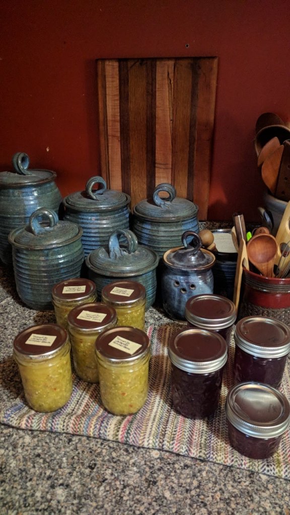 Unless I purchase a box of tomatoes, canning season is drawing to a close for me. I will make a couple of small batches of Asian Pear Orange Marmalade and will can the remaining Tomatillos whole as they mature. The apples are too small to make applesauce but will be pressed for cider and maybe a batch of cider vinegar made. Maybe when apples start appearing fresh at the Farmers’ Market, I will make one canning of applesauce.
