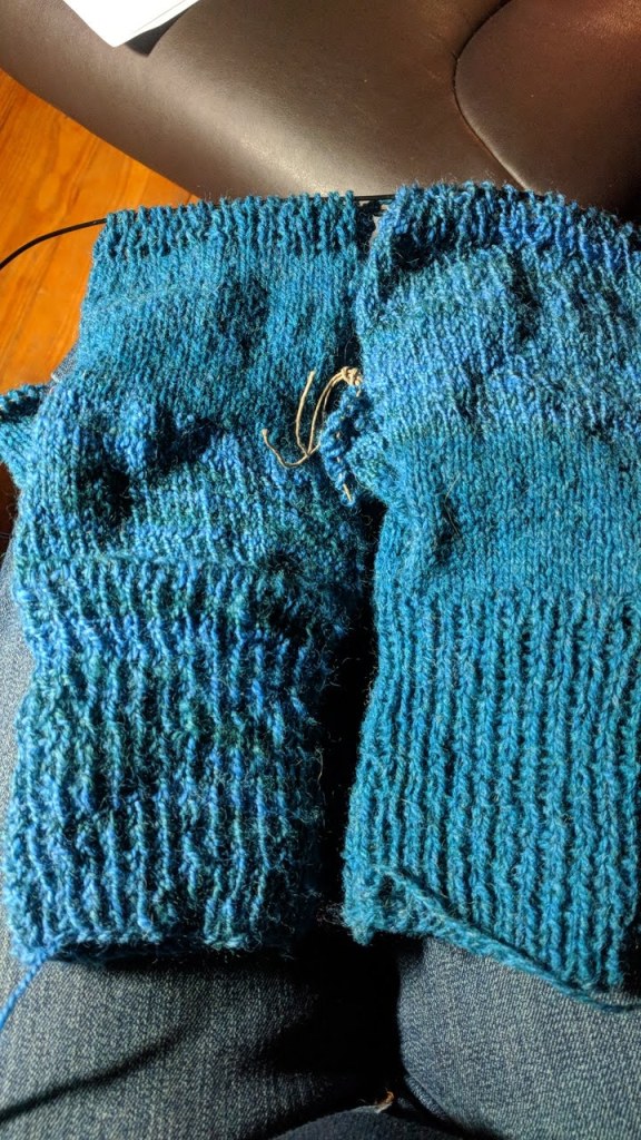 I need about 1/2-3/4″ more of ribbing at the top and the thumbs and they should be on their way by the end of the weekend.