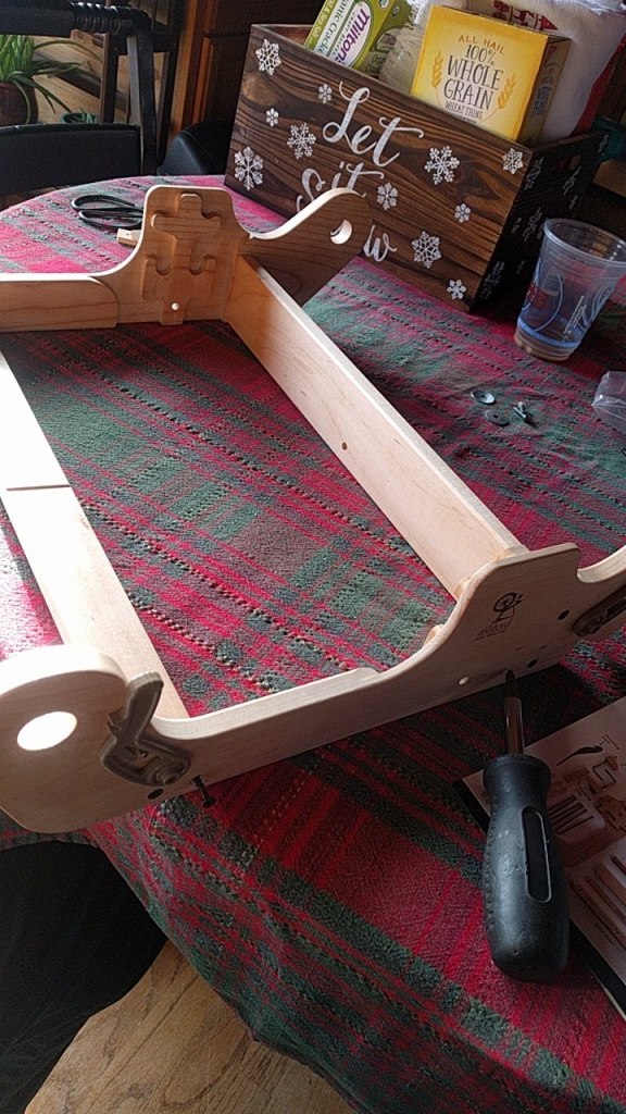 My love added to my fiber toys this morning. Under the tree was an Ashford Samplet 16″ rigid heddle loom.