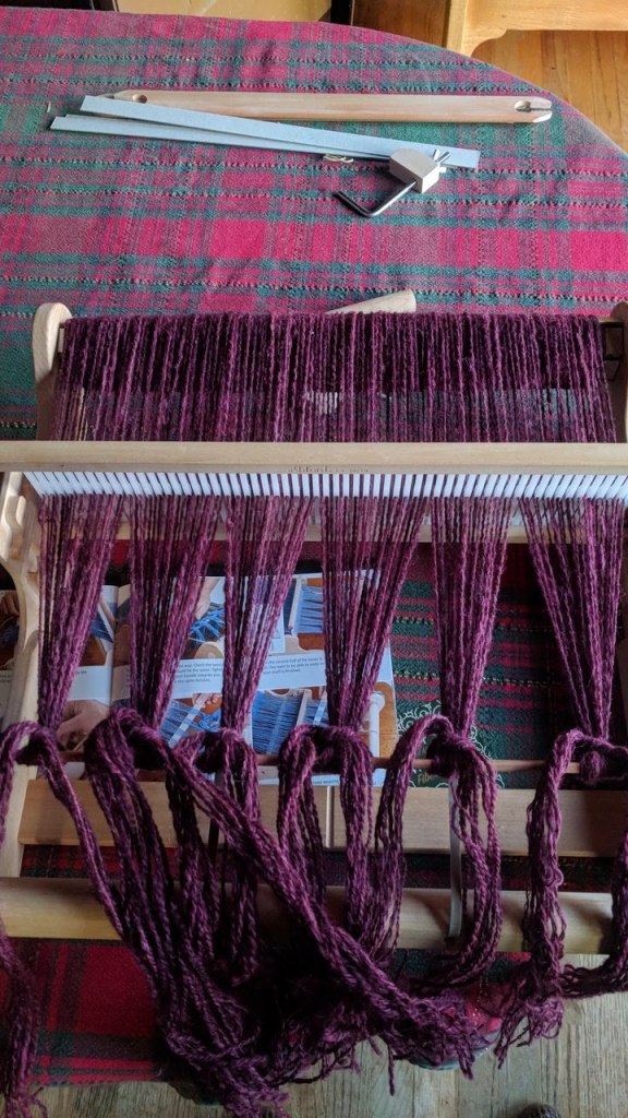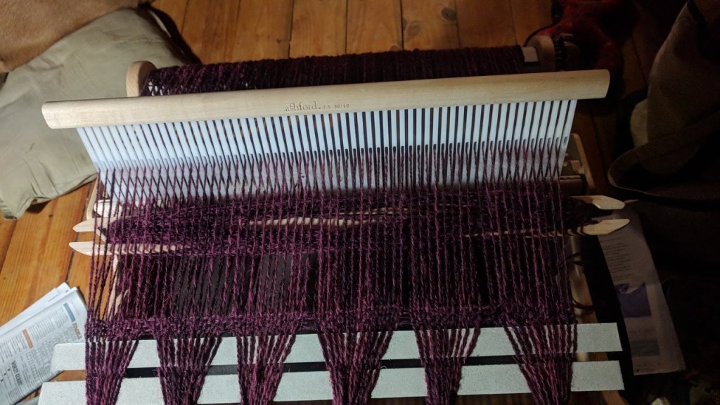 With my recent lesson, having warped my friend’s borrowed loom, and the very detailed instruction booklet, I successfully warped the loom with some of my hand spun dk weight yarn.