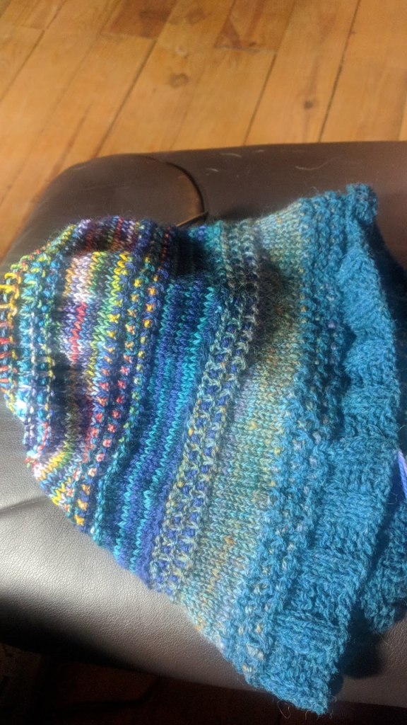 The Toolbox Cowl is progressing. I sat in a waiting room again yesterday and knit. Work has been done on it at night. I’m on the last stockinette section, the second to last skein. There will be one more Diamond tweed section with this skein and the final skein and the last Garter Rib section. I’m not sure I should have used the more brightly colored variegated one, but I think I like it anyway.