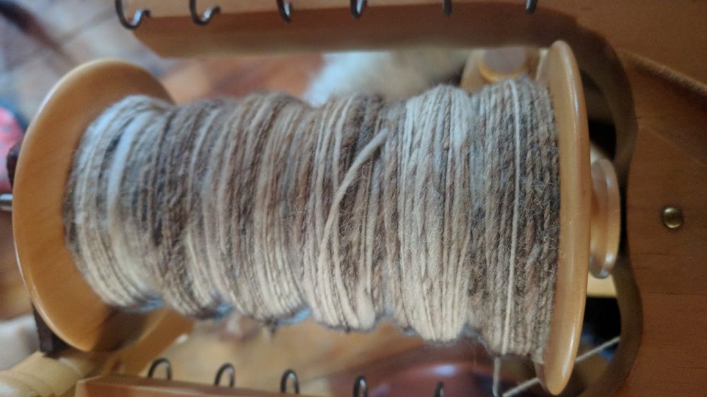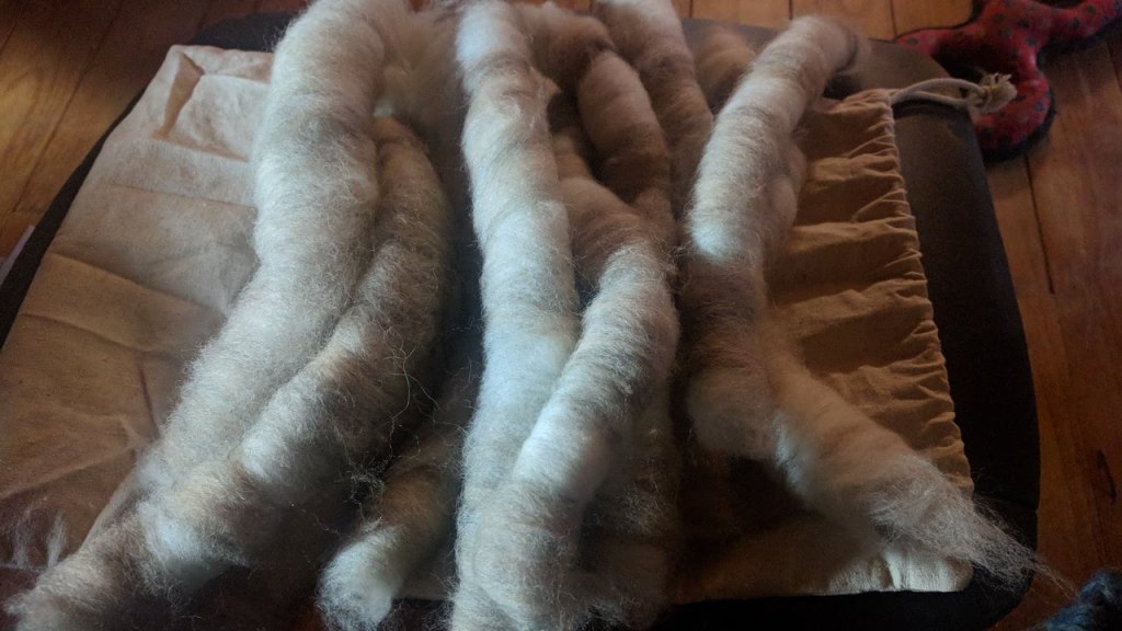 Most of the morning chores are done and I am working on spinning the alpaca/merino and Cormo rolags I blended yesterday morning on my blending board. I have about 2/3 of them spun so far. I didn’t weigh it first, but I think it was close to 4 ounces of fiber.