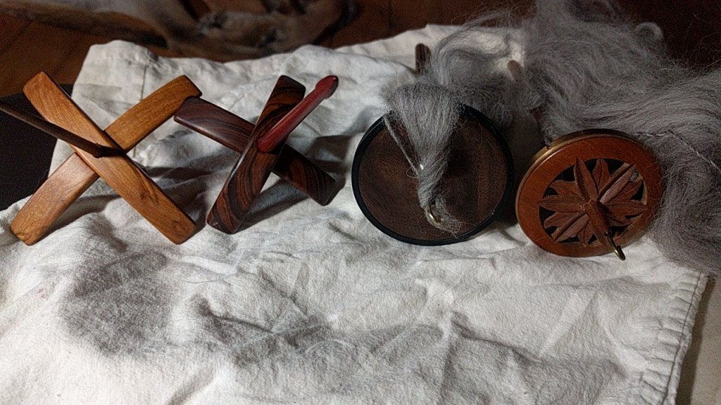 Today I went to our spinning group. One of my friends has sent out an email that she was bringing spindles and weaving yarns to spinning, some she was giving away, some she was selling to destash. She had a 2012 Jenkins Delight Turkish Spindle (they are discontinued) and two Golding ring spindles. One of them was another 3″, a Celtic design and the other a 2 3/4″ with a cut out flower. She had another Turkish spindle, several heavier top and bottom whorl plain wooden one, several 3D printed ones. I couldn’t resist. I bought the Jenkins and the smaller Golding, so now I’m back to 4 spindles that will get used. She gave me a 3D printed one for kids to use and they will join the wagon wheel ones I make for kids.