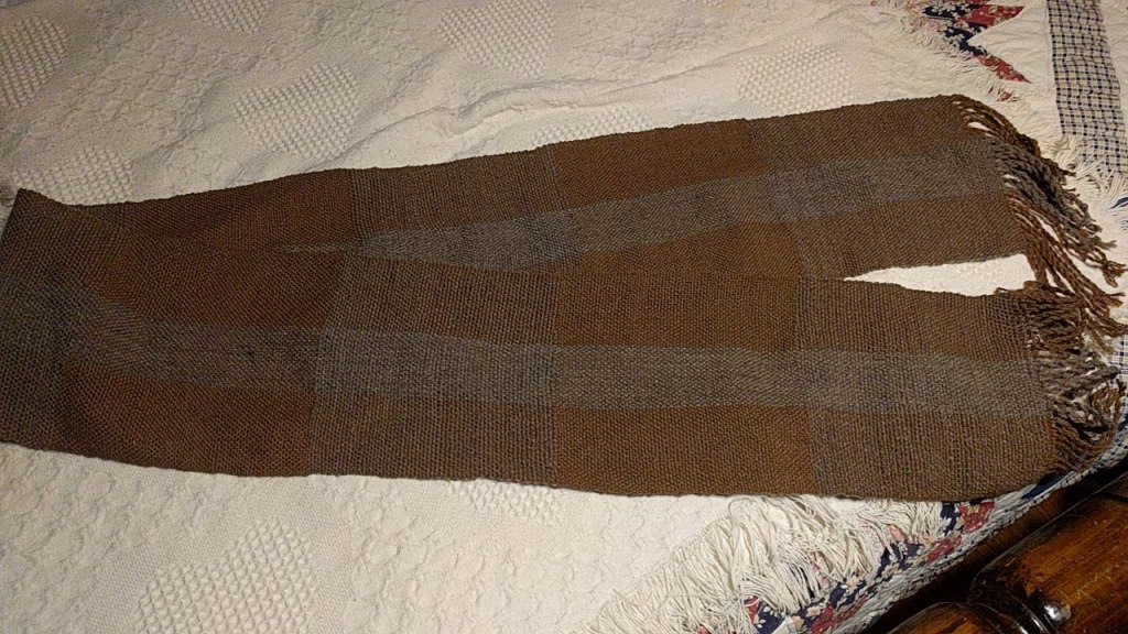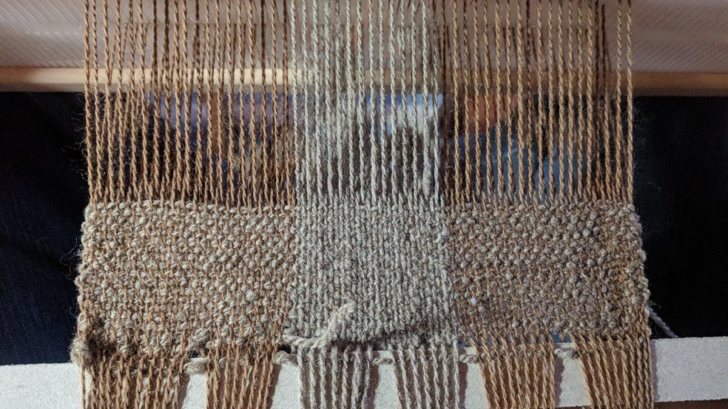 After the above photo was taken, I repaired the lead row, I had failed to shift the shed after inserting the spacer, so I pulled that one and pushed the next one up firmly. The loom was warped with both yarns and the weft weave alternated the two yarns in 8″ long blocks.