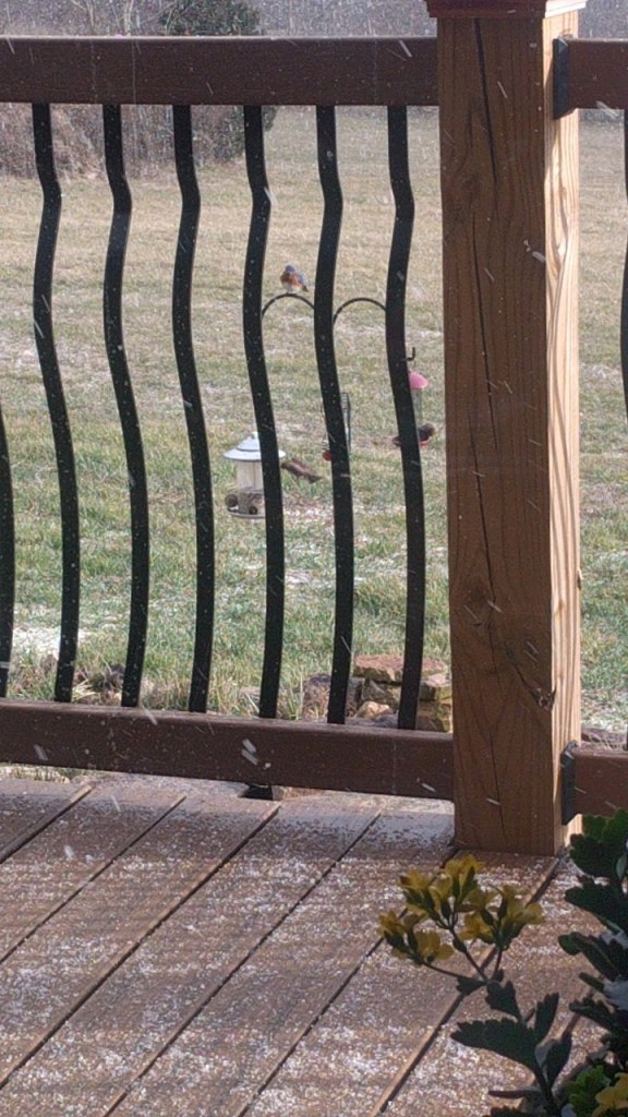This was much later in the afternoon after several snow bursts and melts. The birds clinging to the feeders as the wind howled. As it got dark and the temperature fell, the snow accumulated. It looks like about 3″ on the ground. The wind driven snow has blown all the way across the 8′ wide covered front porch, right over to the front door.