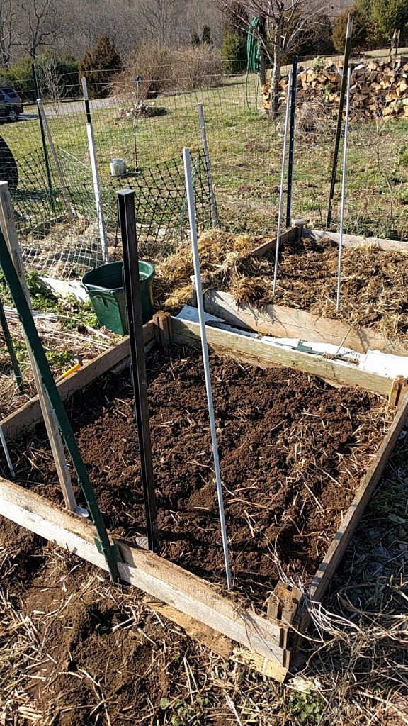 Fortunately it is fairly easy to pull and it attracts native bees, so it only is pulled from the boxes. It is not going down to freezing tonight and tomorrow is another beautiful day, so I am going to take the rest of the 4 x 8 box and boards and corners from another box to build a fourth box between the one planted today and the garlic. I will try to get more newsprint down under that box and move the rest of the soil. The chicken pen is full of good compost, so I will move a barrow or two over to the garden. If I rebuild the long boxes that are falling apart and level the spots where they will be placed, a little at a time, the garden should be ready for the warm weather planting after Mother’s Day.