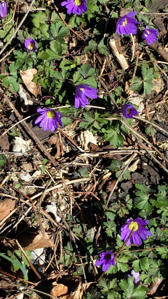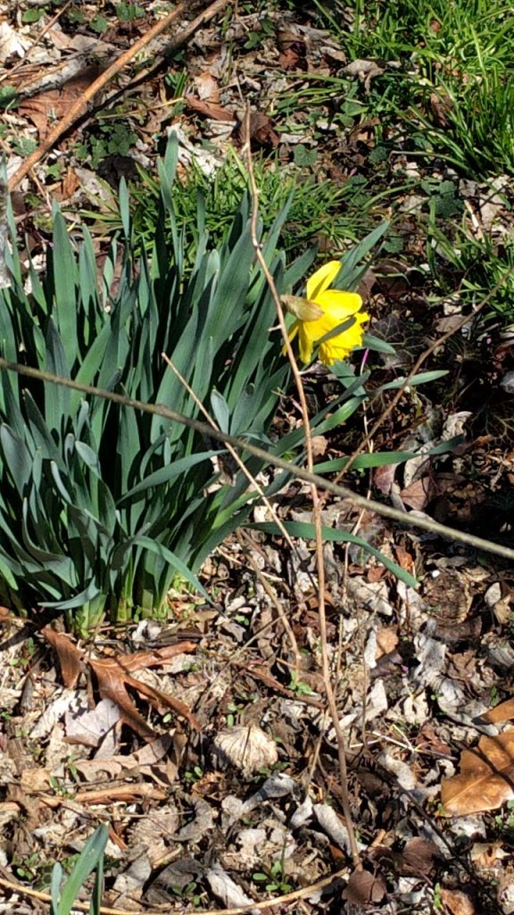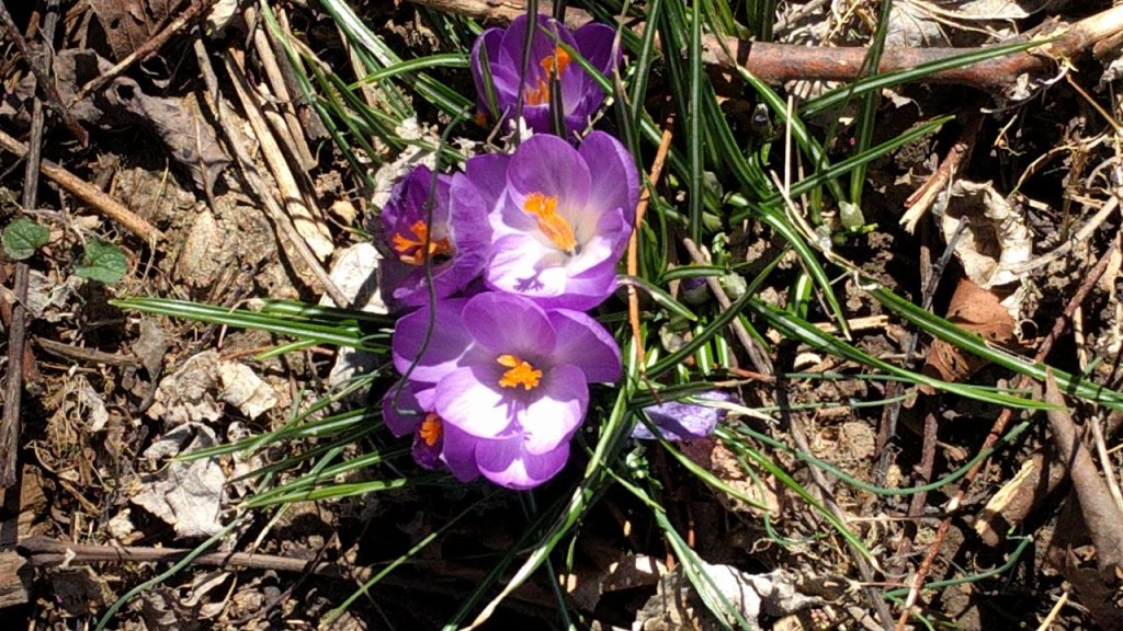 Crocus, daffodils, unknown purple daisy like flower, crabapple buds, pussy willow.