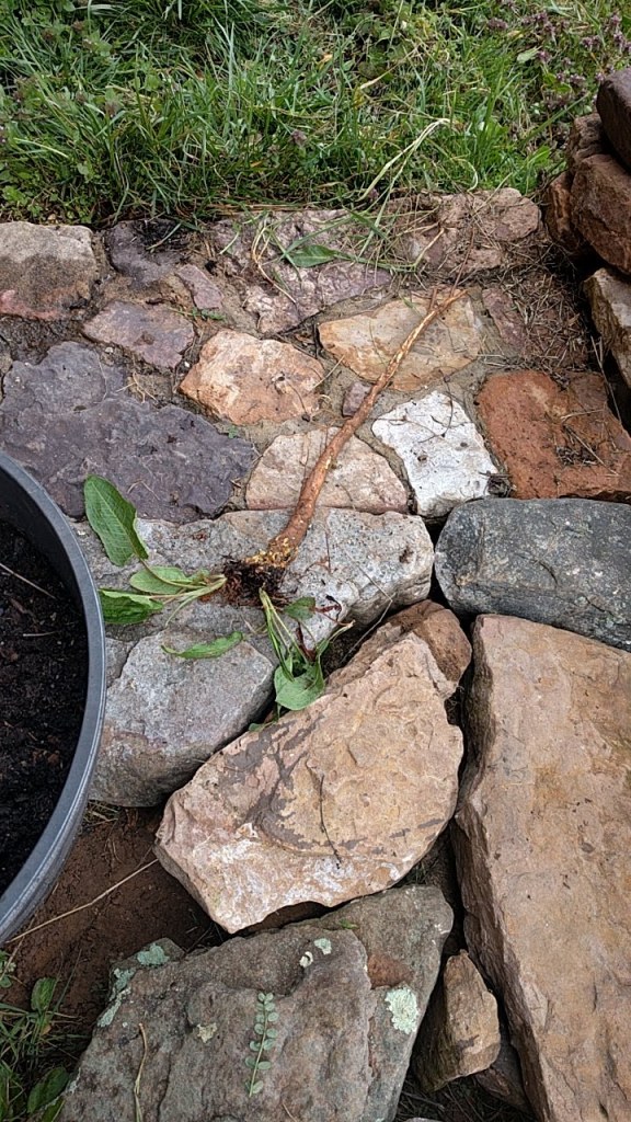 The area inside the wall that gets so overgrown I think will receive a generous handful of mixed sunflower seed and allowed to grow and bloom until it can be cleared of rocks, weed mat or cardboard put down and covered with leaf mulch to plant as the herb, flower, and dye garden. Today’s exercise was moving more rocks and extending the path from the deck to the stone step that was where the old deck ended. That required heavy lifting and some serious weeding. On the step you can see a pigweed root that somehow I managed to lift from the earth whole, it must be 18″ long.