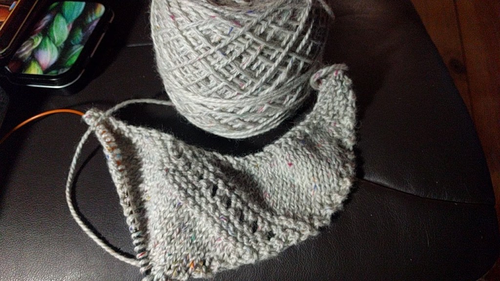When I went to the fiber retreat in late February, I got two skeins of lovely yarn from the hostess. It is a blend of her goats’ mohair and wool. Last night I started a curved asymmetrical shawl and though I went up a needle size from the recommended, it still feels like too dense a fabric for my taste. I am debating continuing or ripping it out and finding a different pattern for the yarn.