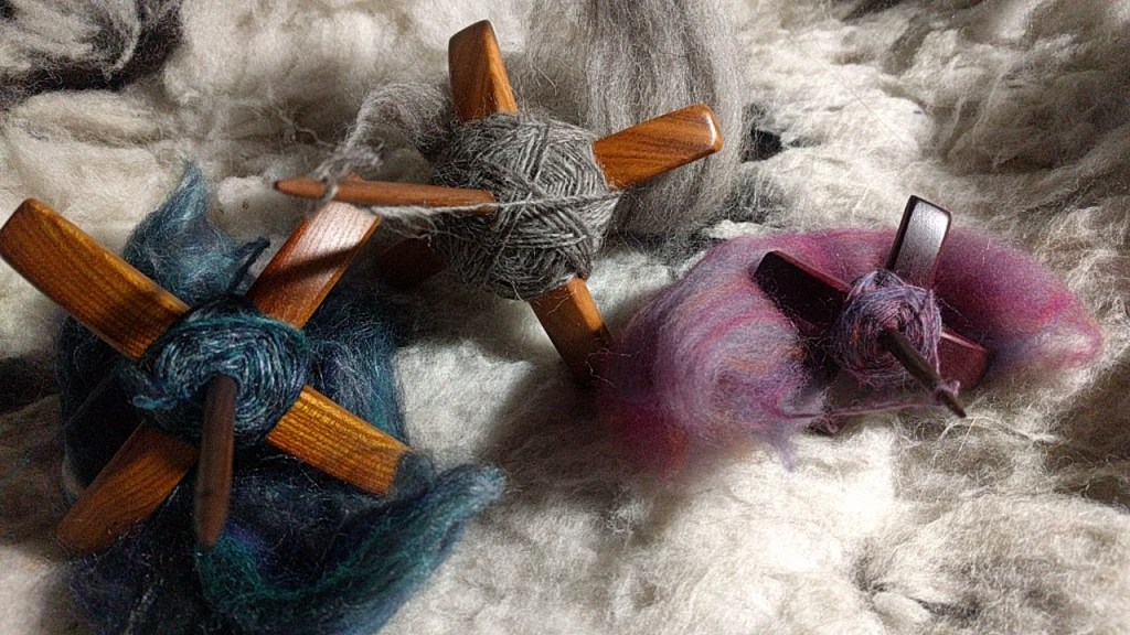 The day between food prep was spent spinning on three of the Turkish spindles. A different fiber on each.