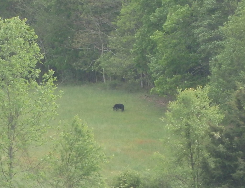 Our kitchen window and French doors from the dining room face south to the depth of our property. When I went down to prep dinner, I spotted a bear in the lower hay field. This is zoomed as much as the camera would zoom, then the photo cropped so that you can actually see the bear. This one is much larger than the little one we saw a few weeks ago, probably 125 to 150 pounds. It was a couple football fields away and seemed totally unaware of me on the deck taking it’s picture. It finally moved closer to the house, but stayed on the other side of the lower hay field fence, the disappeared into the woods to the west. Some years we don’t see any, this year we have had three sightings, two on our property and one near the bottom of the road near the creek.