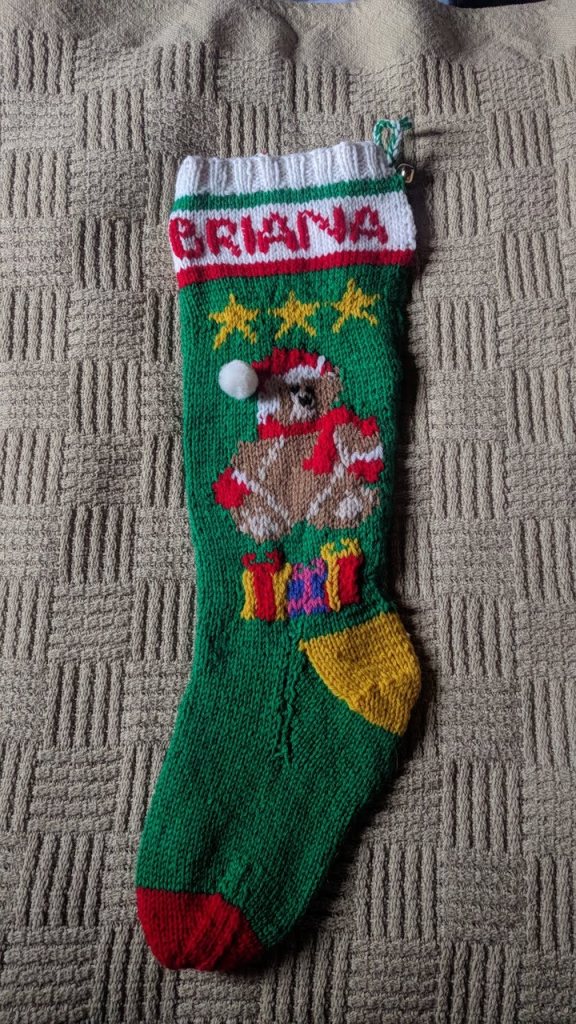 Son 2 adopted his wife’s firstborn and they had a little girl the same year daughter had a little girl and I started knitting the intarsia stockings. That year I made 4, one each for the two little girls, 1 for Son 2’s son, and one for grandson 1.