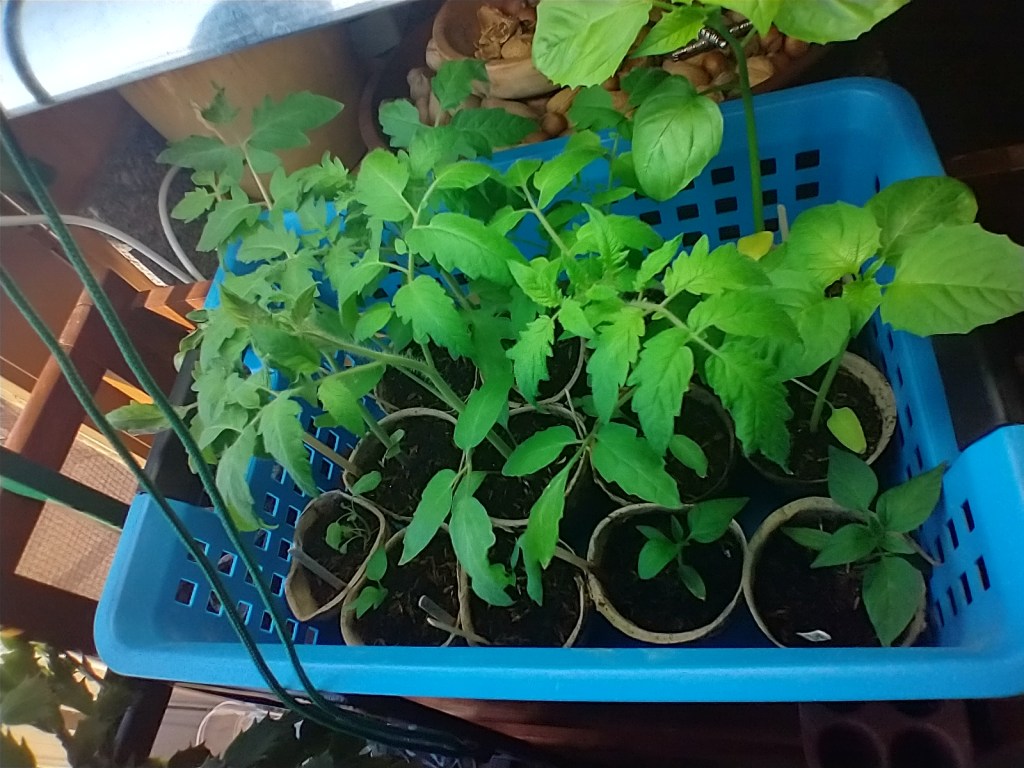 The tomato, tomatillo, and 2 of the varieties of pepper starts are thriving. This week, they will begin daytimes on the back deck sheltered initially, and later full on in the sun to harden off for planting in about a month. Yet again, I seem to have started them a couple of weeks too early.