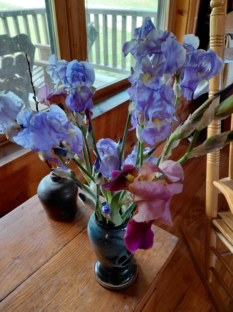 The bearded Iris are glorious right now, at least the purple ones. Two vases cut and brought in the house and dozens more blooms in the garden beds. The Amaryllis that was gifted me in bloom several Christmases ago has bloomed later each year. It is just about to have this year’s blooms open. When it is done blooming and the weather stabilizes, it will move outdoors for the summer.
