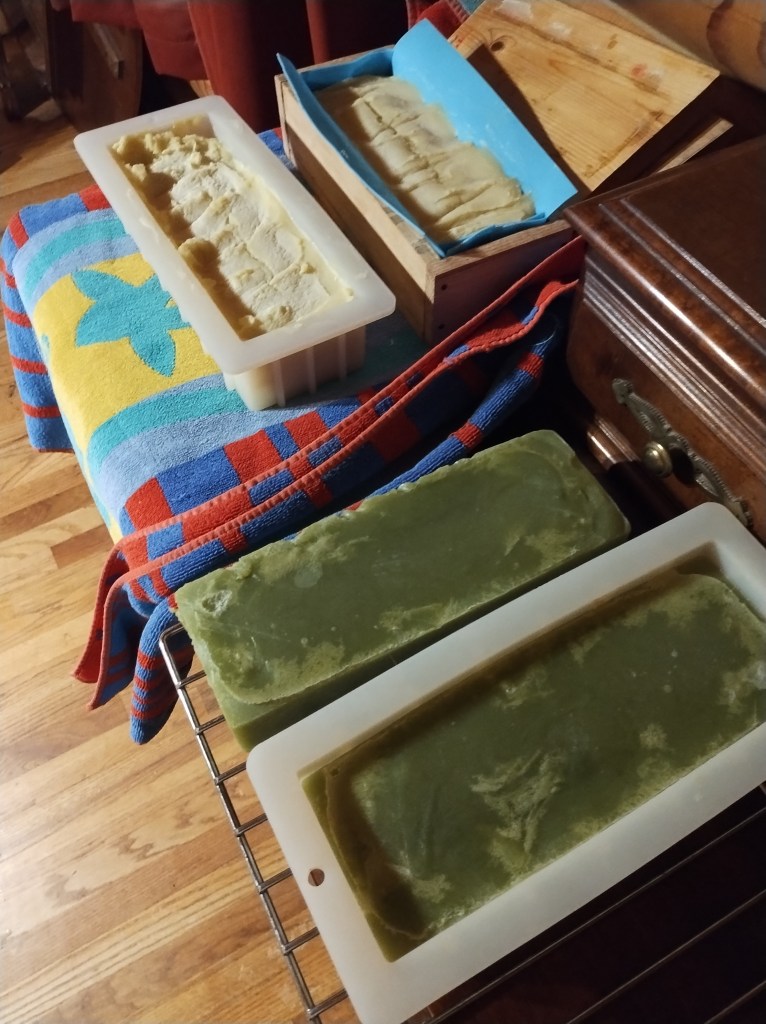The batches at home were made Tuesday and Wednesday of this week. On Tuesday, a double batch of one scent was made and I won’t do that again as it took forever to get to the consistency to pour it in the molds and is still not as firm as I would like to slice it into bars. The Wednesday batches will be unmolded and cut tomorrow to cure for a month before going to the folks for whom it was made.
