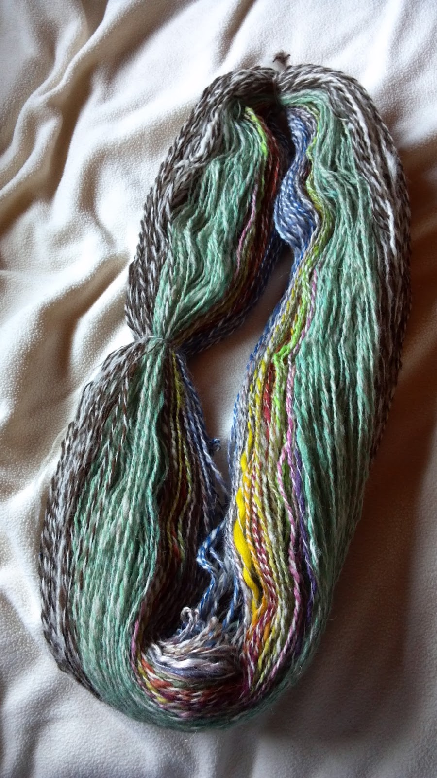 When I bought my new spinning wheel, to get used to it without “wasting” good fiber, I took all the ends and samples that I had around and started spinning, adding the next bit when the bit I was working on was gone. This had me spinning Merino and Merino/silk blend that I had used before, but also got me to try an assortment of other fibers such as Llama, Llama/Mohair, Corriedale wool, Blue Faced Leicester/silk blend, Alpaca, Shetland/Llama, Pendleton/Angora, Llama/wool, Cottswold Tunis cross wool, and Shetland/Mohair blend. Some of the samples were neutral colors, some bright and vivid. When they were all spun into a lightweight single ply, I spun an equal amount of Blue Faced Leicester that was undyed into another lightweight single ply. I worked on this at the weekly spinning group to which I belong, The Spunsters, and when we arrived home after the wicked summer storm that hit and discovered that the power was out, I finished that bobbin and plied the two singles together to produce this