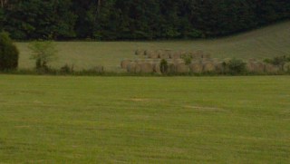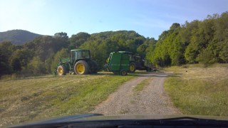 Two trailers of 22 bales being hauled away. The low field and the western most field have been mowed, but not yet raked and baled. The low field is the largest and where most of the hay will be baled.