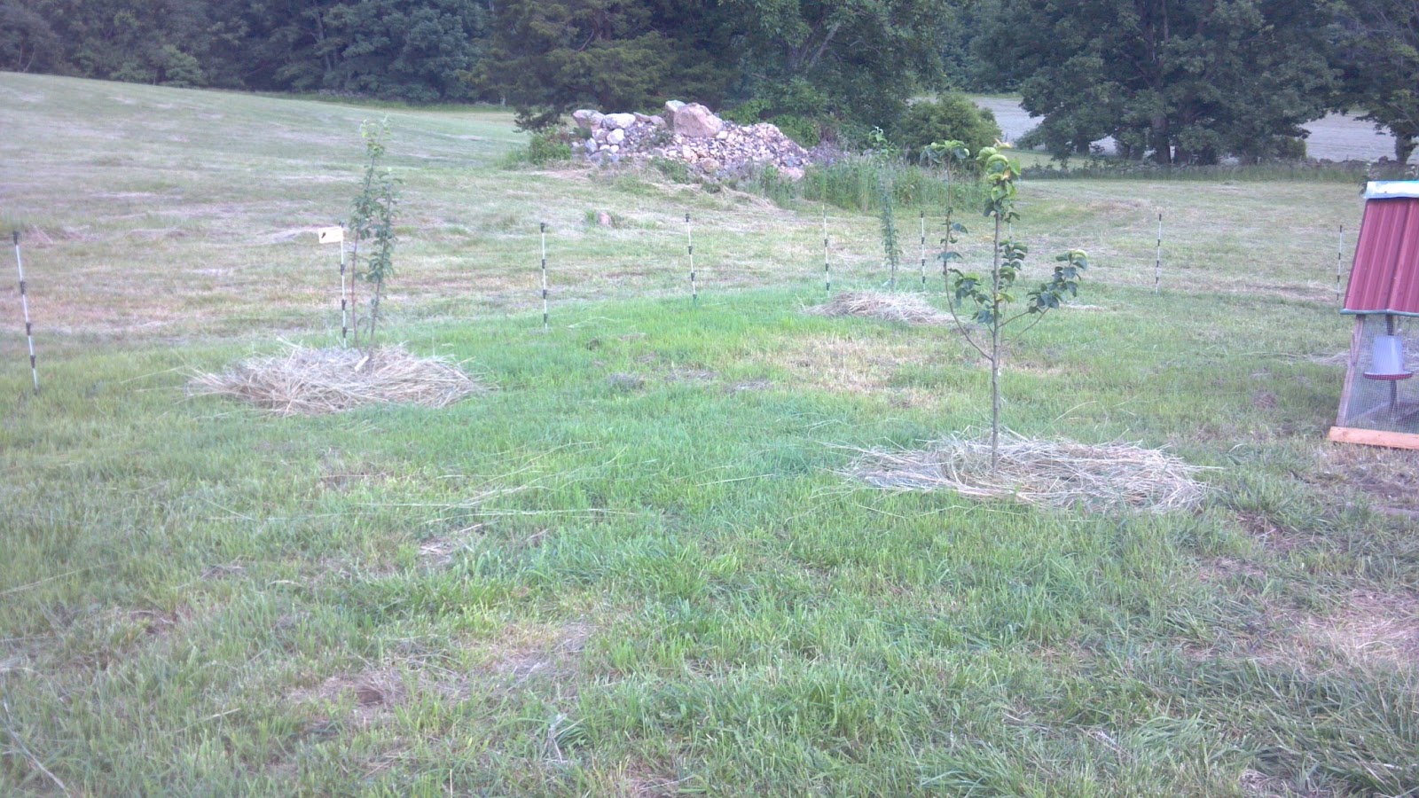 Hopefully, this will keep the weeds down, hold the moisture and help the 10 young trees to thrive. Using some of the hay that was dragged out beyond the baling area, the tomatoes and peppers were also mulched and while working in the garden, the nut and wire grass that has been taking over the grape bed was removed. Tomorrow, I will put down weed mat and cover it thickly with more hay.