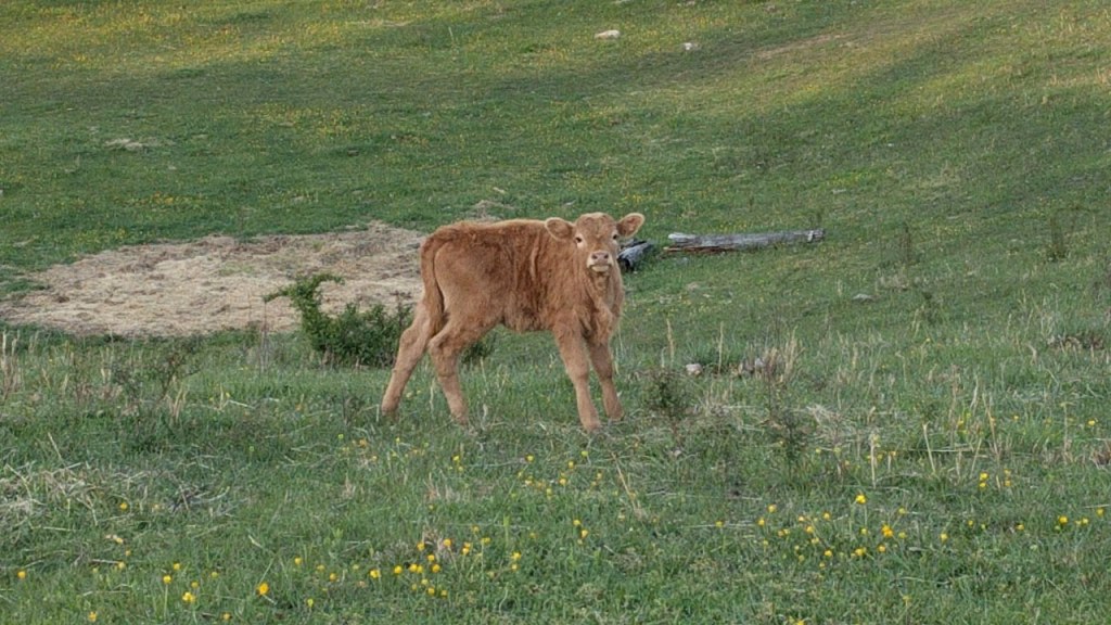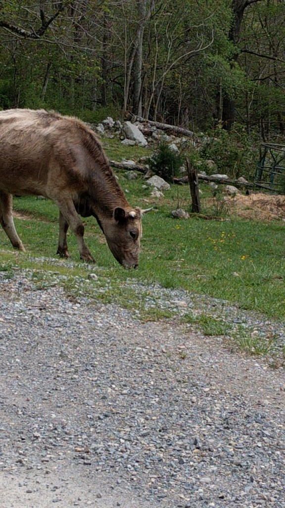 This young one was more interested in me than the hay. Back on the road home, there were two cows with their calves that I had to walk quietly by. One calf was nursing and not at all concerned about me, the other’s mom was unconcerned, but the little one was less sure.