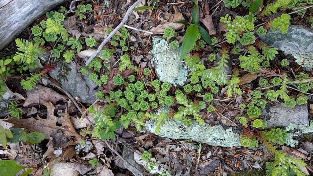 The bony white cow in the back with all the calves is neighbor’s oldest cow and she seems to be the baby sitter, every time I see her she has a brood of calves with her and only one of them is hers. The “angel” sitting on the point was given to me by a boss when she retired. Every year since, I have received a holiday card from her with news of her kids and grand kids, and of a few former co-workers. I didn’t hear from her this year and have no one to contact in the area to see if she is okay. When she retired, she gave every member of the counseling office staff an angel to remember her by, she loved angels. When we bought this property, the angel was put on the point and visiting the point is getting more difficult now that nothing grazes up on that part of the farm. The bottom photo is a wild sedum of some sort that was all over the damp area around the point.