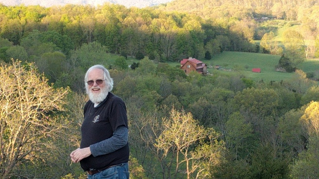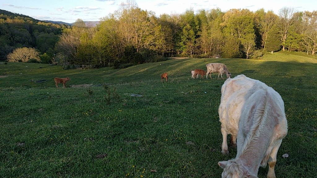 This steep moss covered hills crests to a high spot where I can look down on the hollow and our house. Back down this hill across the pasture I see groups of cattle munching on hay.