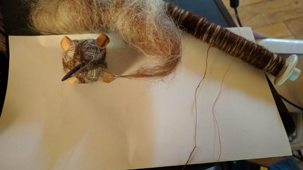 On Monday, I received a tiny spindle that I have wanted for quite a while. The little tool spins cobwebs. The thread on the bobbin was spun on that little spindle, the thread to the right is sewing thread.