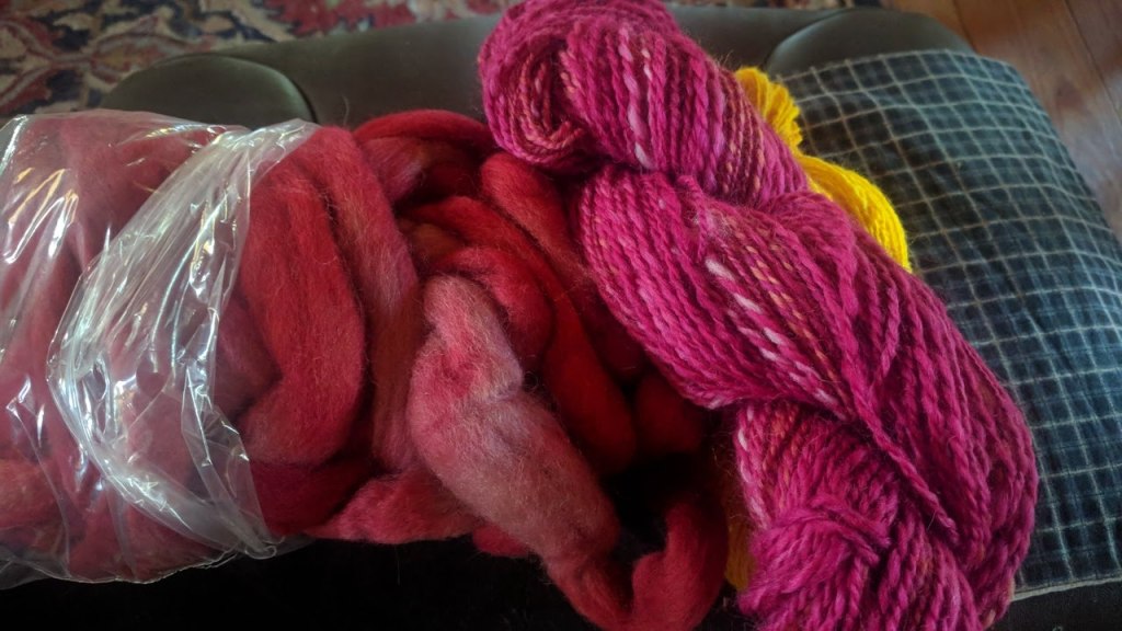 About a week ago, I left for a fiber retreat in the south west part of the North Carolina mountains. The venue was delightful, as was the company of the friends that gathered. It began a week that has been devoted to fibery crafts. For the retreat, I had packed plenty of fiber to keep me busy spinning, but half way through the first day, I got bored with the natural colors that I generally spin and indulged in a grab bag of sunshine yellow and heirloom tomato red Romney wool. The idea was to work a gradient beginning with the yellow, but as I pulled it out of the bag, I realized that though they looked lovely together in the bag, they would not gradient, so the slightly more than 3 ounces was spun separately and it plyed up finer than I had hoped for as I wanted to weave a shawl with the 8 ounce grab bag. Once home Sunday afternoon, I began on the red using a long draw technique and got 4.9 ounces of yarn heavy enough to weave, but not enough yardage.