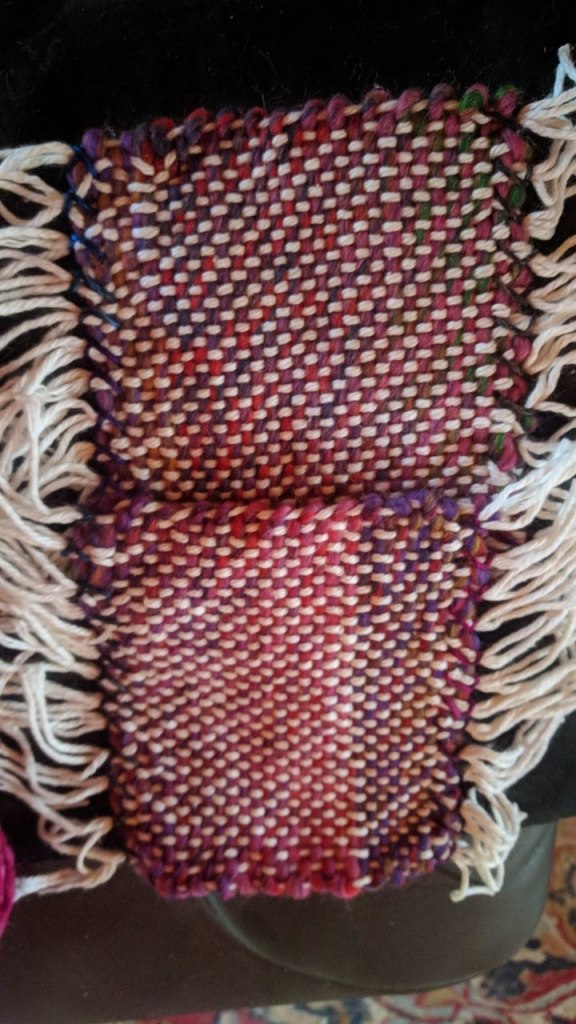 At the retreat, I took a class in Rigid Heddle weaving. It is not new to me, but looked like fun. The instructor had prewarped the looms with white cotton and I grabbed a skein of Aran weight Acrylic to use as my weft. We made two mug rugs in class and after. I failed to leave enough space between my two to get good fringe, so did rough easy to remove knots until I got home. Last night I sat and hem stitched the edges after removing my temporary knots, and evened the fringe on them.