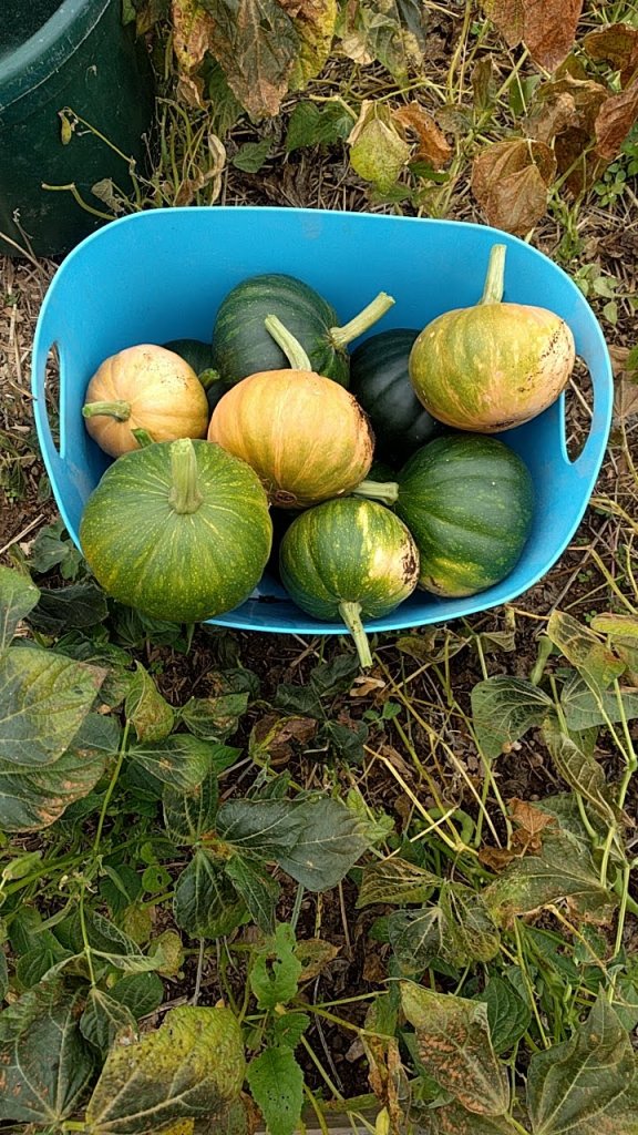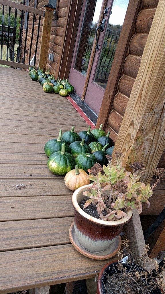 Jack Frost made his arrival 14 days after the average frost date for our area in the mountains. And he returned the next night too. Though neither frost was a “killing” frost, it did burn the leaves on the pumpkin vines, revealing the 4 dozen fruits hidden in their midst. Most are still green, but Google says they can be set on a sunny patio and will ripen. There are no more frost dates in the forecast for about 10 days (of course that can change in a blink), so they will sit and cure or ripen until it looks like the weather requires they be brought in to the root cellar.