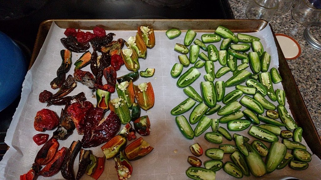 The Calendula still has many buds and because of it’s sheltered position along a south facing stone wall, I may be able to continue harvesting them to dry for salves for another month or so. The peppers were all cut in half lengthwise and for the next couple of days, the house will be piquant with the scent of capsaicin as the oven is used as a dehydrator to reduce the moisture in them for storage.