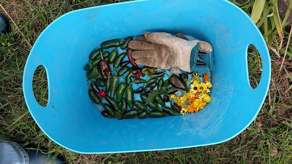 The frost wasn’t enough to totally kill off the remaining peppers, but to make sure they weren’t wasted, the last of them were picked, along with a handful of sheltered Calendula flowers.