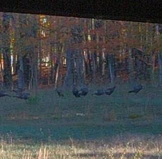 The overcast weather brings the wildlife out into view. The week has brought a large flock of wild turkey repeatedly out to forage the hay field for bugs and seed. Each late afternoon and often early mornings, a herd of deer seemingly materialize from the edge of the trees, one at a time to graze in the same field, and a doe with her twins from spring frequent the area around the barn each evening. They seem to know that we are safe and do not flee when we are out around the house and going over to deal with the chickens. They raise their heads, look in our direction, and return to grazing on the still green grass.