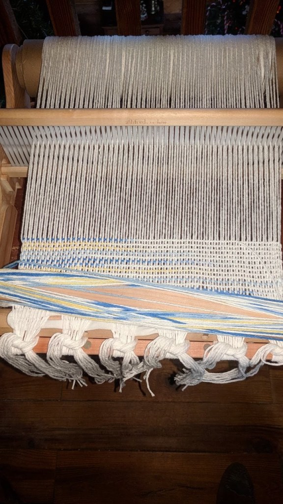 Christmas brought us some news that has the loom already rewarped with cotton. The warp is white, the weft is variegated, but I don’t think it has enough color, so tomorrow a trip back to Joanne’s will be made to try to match one of the colors in the variegated yarn to add stripes of color.