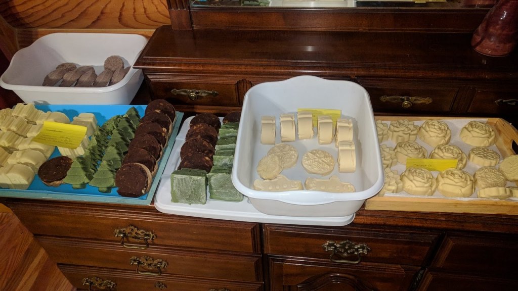 Unless that guest room is needed in the next month, the soap will sit there and cure for hardness. It only takes 24 hours for it to go from caustic solution to saponify to soap. Once it is hard, another day or so will be used to package it for the various markets. The holiday shapes, you can’t see all of them because of the picture angle, but there are snowmen heads, trees, snowflakes, flowers, and sheep, will be bagged in glassine bags with tags for the holiday markets. Plain round, square, or rectangular ones for the Harvest Market at Booker T. Washington Park will be banded with craft paper bands.