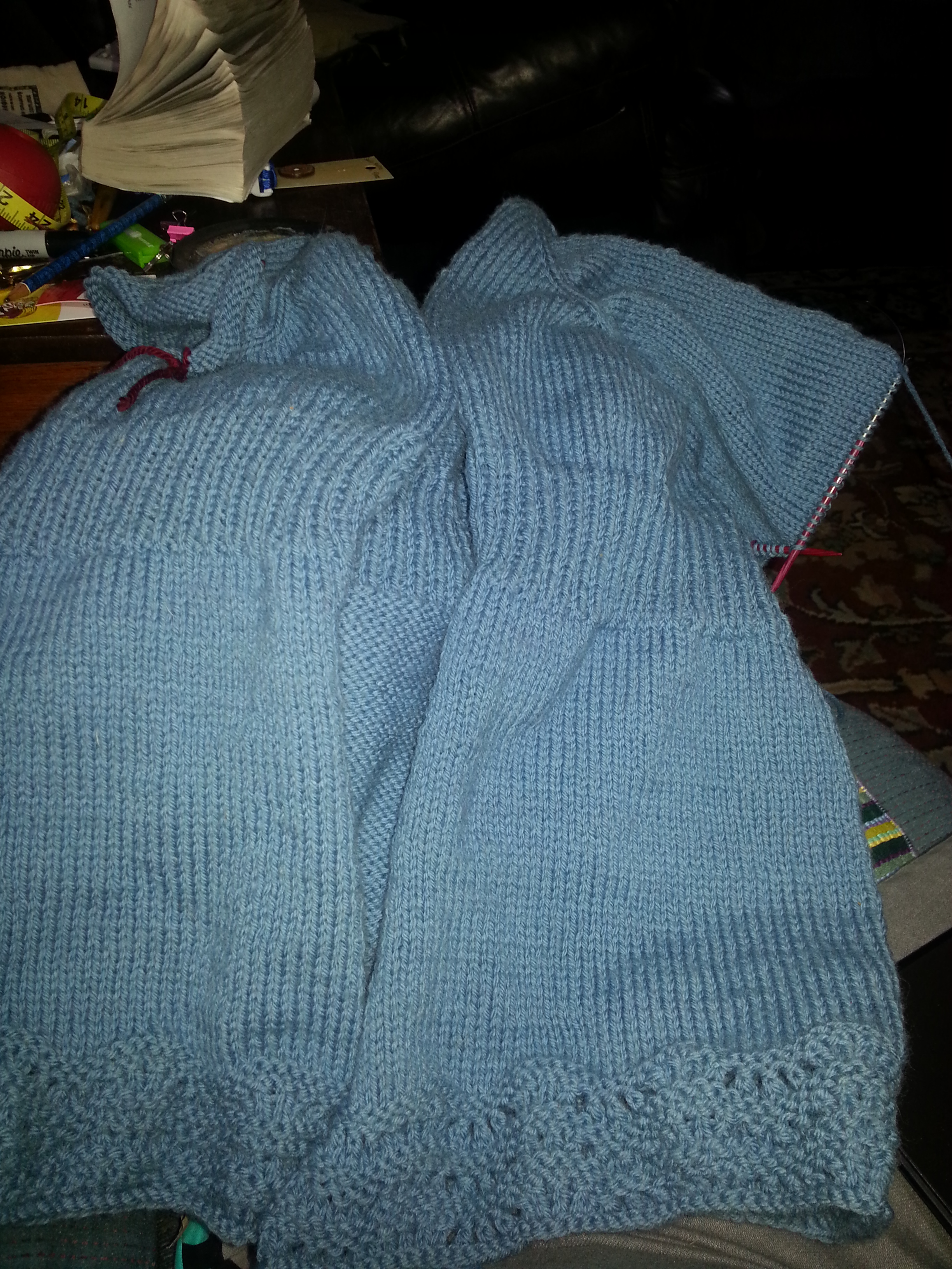 Because of the lack of a spinning wheel and to try to have my sweater finished before the storm next week, I have been knitting only on Estelle. Last night I finished the second sleeve and picked up and knit the first 2 rows of the feather and fan band.